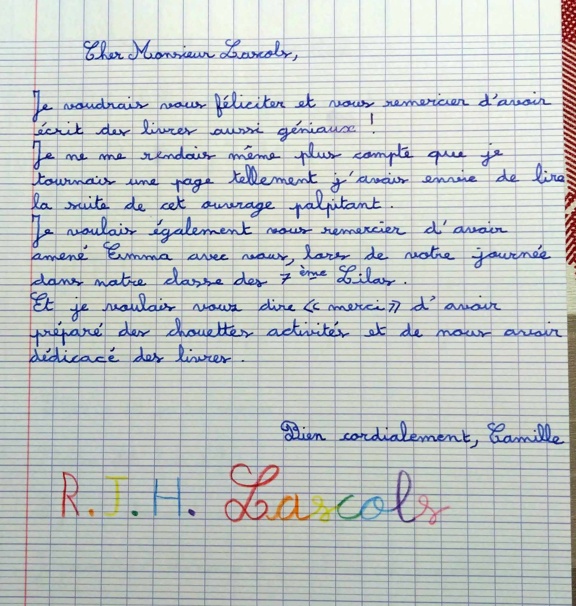 Merci beaucoup d’avoir écrit ces livres et de me les avoir dédicacés. Sachez que votre « maitre » est adoré de ma mère et que vous le seriez certainement aussi. J’aimerais que vous sachiez également que j’adore les personnages de votre livre et que j’ai beaucoup aimé cette journée.